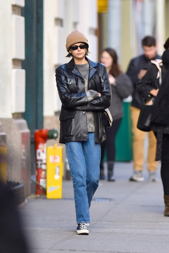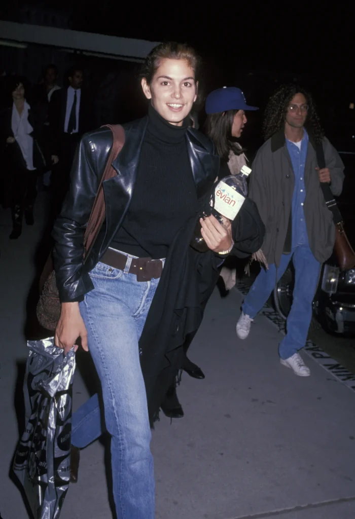 Dans les années 1990 déjà, les It girls et mannequins de l’époque ne juraient que par cet ensemble. En témoigne cette image culte immortalisée par les paparazzis : celle de Cindy Crawford qui, habillée d’un jean cigarette et d’une veste de blazer en cuir, rejoint sa porte d’embarquement dans l’aéroport de Los Angeles. Vingt ans plus tard, c’est sa fille, Kaia Gerber, qui succombe à son tour à ce combo indémodable.